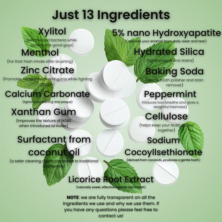 By formulating toothpaste tablets, we are able to cut down on plastic waste and get rid of the unnecessary ingredients you'll find in traditional toothpaste.